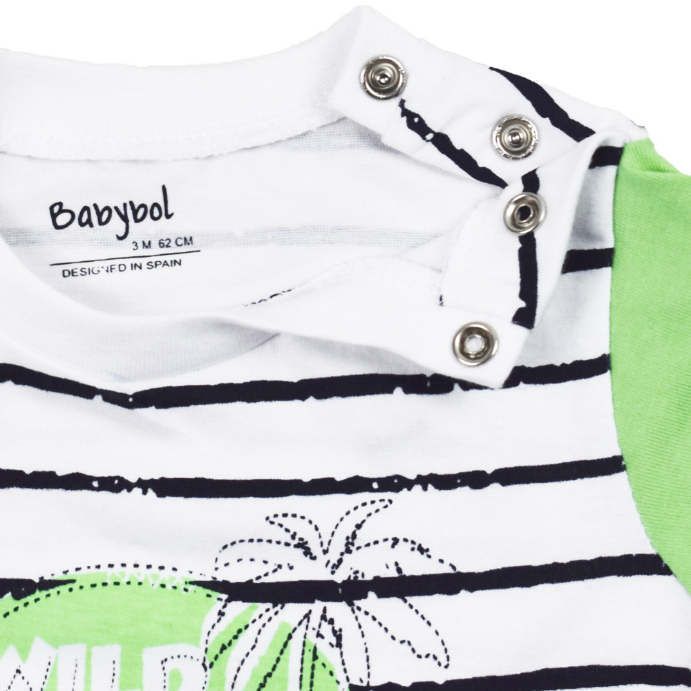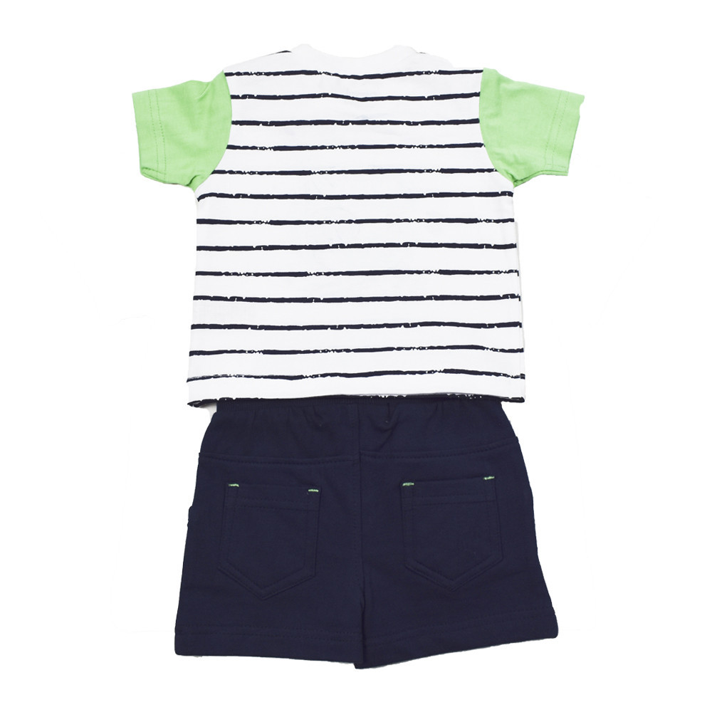 Трикотажний річний комплект Babybol зручний, практичний і ніколи не буде зайвим в гардеробі Вашого хлопчика!!! Футболка і шорти виконані з 100% бавовни. Смугаста футболка з круглою горловиною, перед з веселим дитячим принтом. Кнопки на плечі для розмірів до 3 років забезпечать і прискорюють процес одягання малюка. Короткі шорти, на талії мають трикотажну гумку і шнурок для регулювання об'єму талії. Спереду дві прорізні кишені, ззаду два накладних.