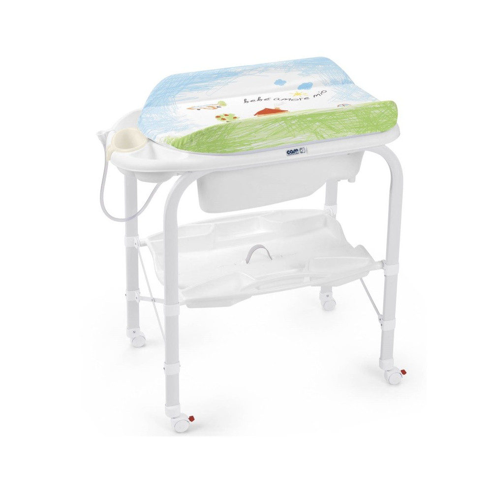 Пеленальний столик з ванночкою Cam Cambio - сучасне і зручне придбання, яке стане необхідним для вас з моменту народження малюка. Пеленатор і ванночка встановлені на раму. Пеленатор має м'яку поверхню, а ванночка отвір для зливу води, поличку для ванних приладдя і додатковий піддон для зберігання різних речей. Пеленатор з ванночкою Cam Cambio в зібраному вигляді має компактні розміри, що дуже зручно при зберіганні. Столик не має гострих кутів і деталей.