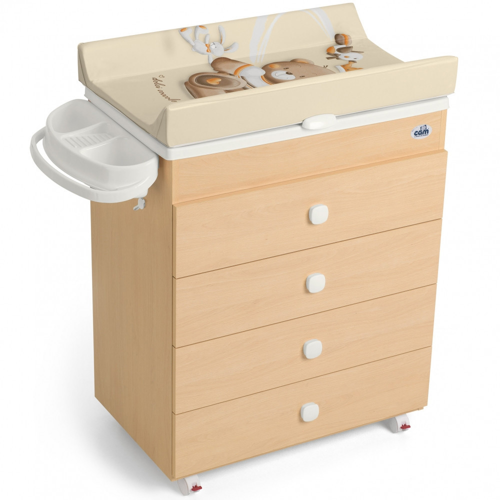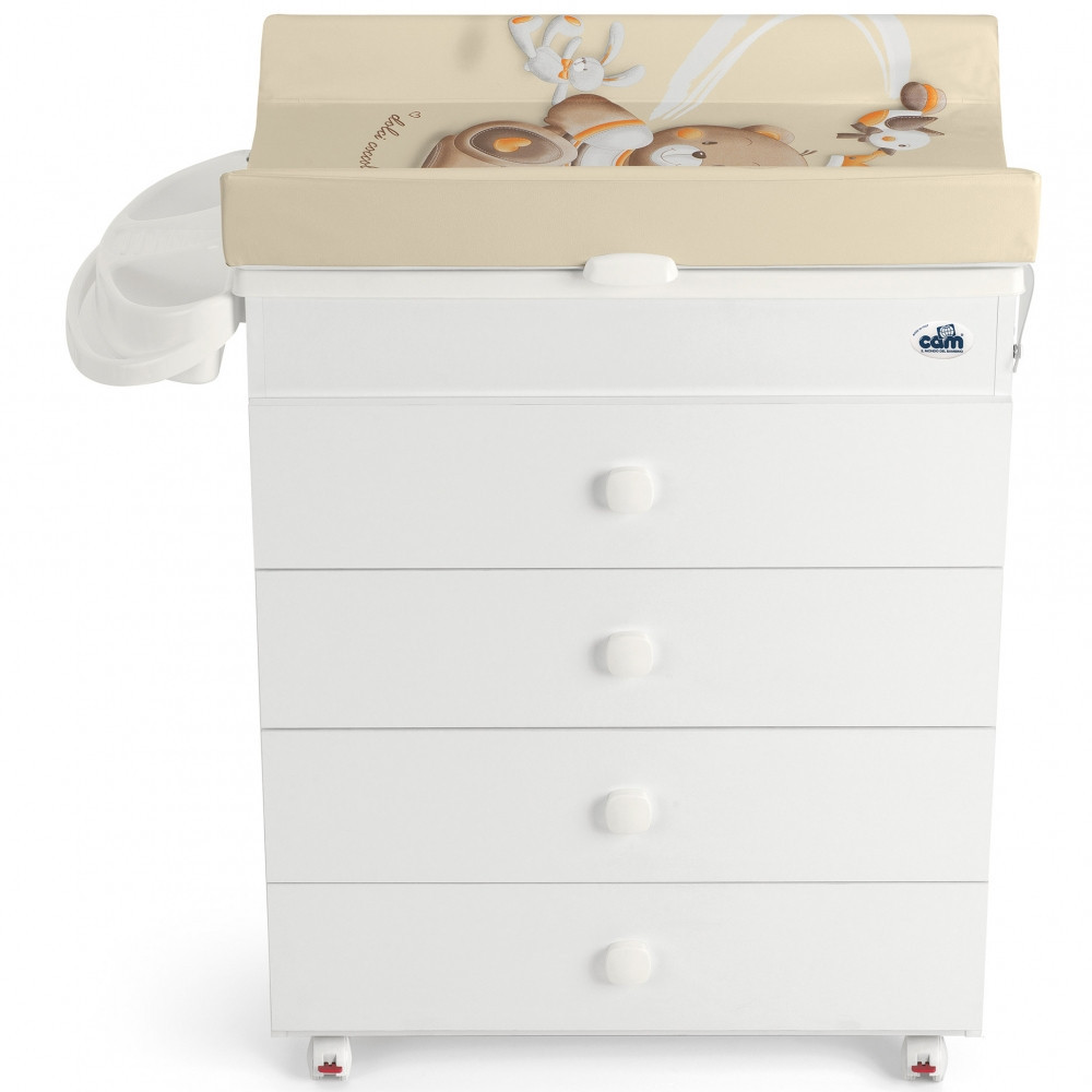 Комод з сповивальним столиком і ванночкою Cam Asia- один з кращих багатофункціональних комодів для використання з самого народження. Cam Asia обладнаний підставкою для ванних приналежностей, чотирма ящиками для білизни і чотирма колесами, забезпеченими гальмами. Ванночка і сповивальний матрацик легко знімаються з кришки комода. Коли необхідність у сповивальному матрацику зникне, його можна замінити дерев'яною кришкою, завдяки чому комод стане повноцінною частиною меблевого гарнітура.