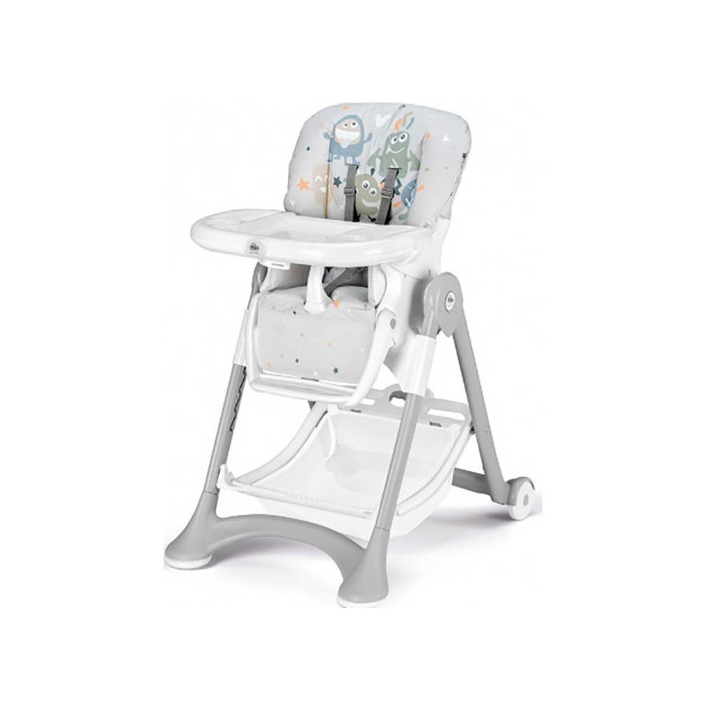 Новий запатентований механізм дозволяє регулювати одночасно спинку і підніжку в 3-х позиціях. Дитина може спати в стільчику, як в шезлонгу. Завдяки колесам стільчик легко переміщається в будь-якому напрямку, колеса забезпечені гальмом. Стільчик Campione має 5-ти точковий ремінь безпеки і столик з підносом, який легко знімається. Конструкція не має гострих країв. Чохол легко чиститься і не линяє. Передбачена широкий кошик для іграшок.