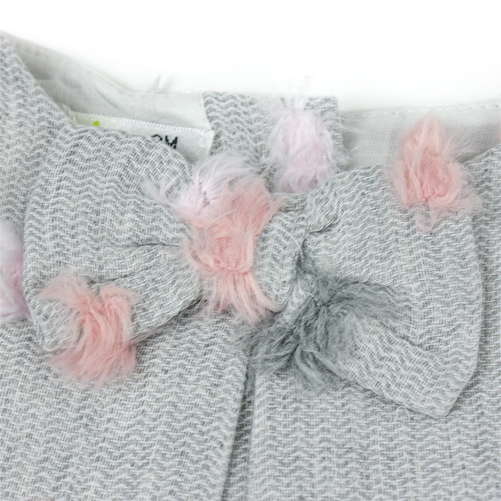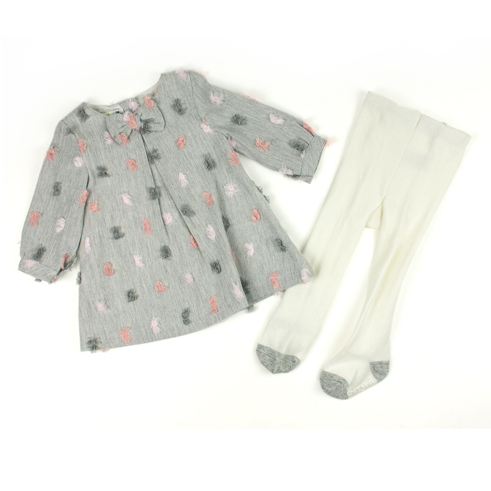 Прекрасний комплект Babybol для дівчинки складається з сукні та колготів. Сукня з довгим рукавом, на підкладці із 100% бавовни. Застібається на гудзики по всій довжині. Спереду є складка з бантом. У однотонних білих колгот носочок і п'ятка сірі, як основний тон сукні.