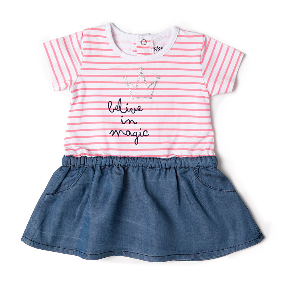 Усі дівчатка люблять гарні сукні, навіть найменші. Така гарна комбінована сукня Babybol стане відмінним придбанням для літнього гардеробу Вашої улюбленої малечі. Верх сукні трикотажний, джинсова спідниця. Спереду прикрашений принтом. Застібається на спинці на кнопки. Кнопки розміром до 3 років. Сукня виготовлена тільки з натуральних та гіпоалергенних тканин, вона чудово підходить для такої чутливої та ніжної дитячої шкіри.