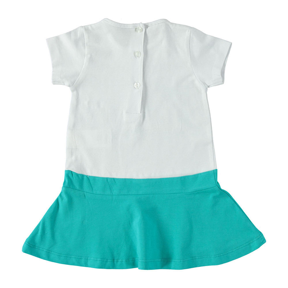 Ви шукаєте подарунок для своєї дівчинки? Ось сукня, яка Вам потрібна! Трикотажне, бавовняне, з короткими рукавами, круглою горловиною, відрізне по лінії стегна. Перед прикрашений принтом, спідниця одного кольору з принтом. Застібається на спинці гудзиками.