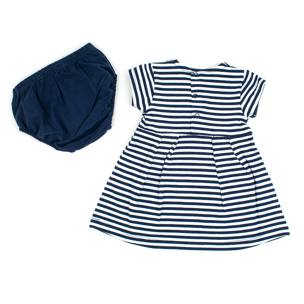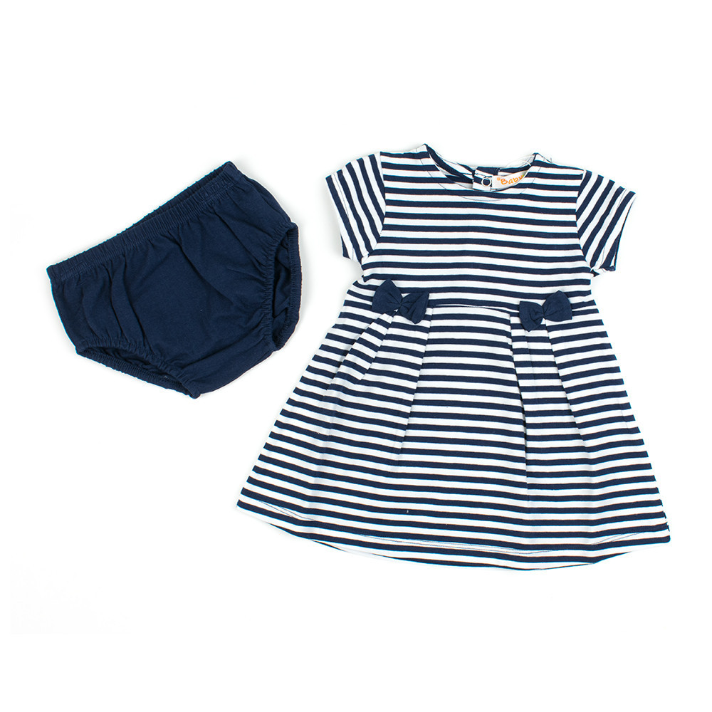 Чудовий літній трикотажний комплект BabyBol для малюка складається із сукні та трусиків. Смугасте трикотажне плаття прикрашене однотонними бантиками і застібається на спинці на гудзики. У комплекті є однотонні трусики.
