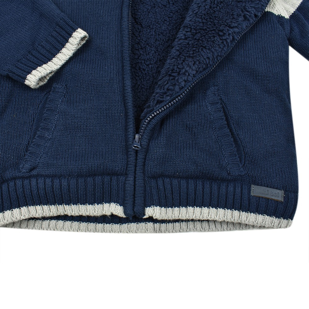 В'язаний светр Babybol сподобається Вашій дитині. Светр з каптуром, з контрастними вставками на плечах і рукавах, кишені прорізні, всередині светра штучне хутро. Застібається светр на блискавку.