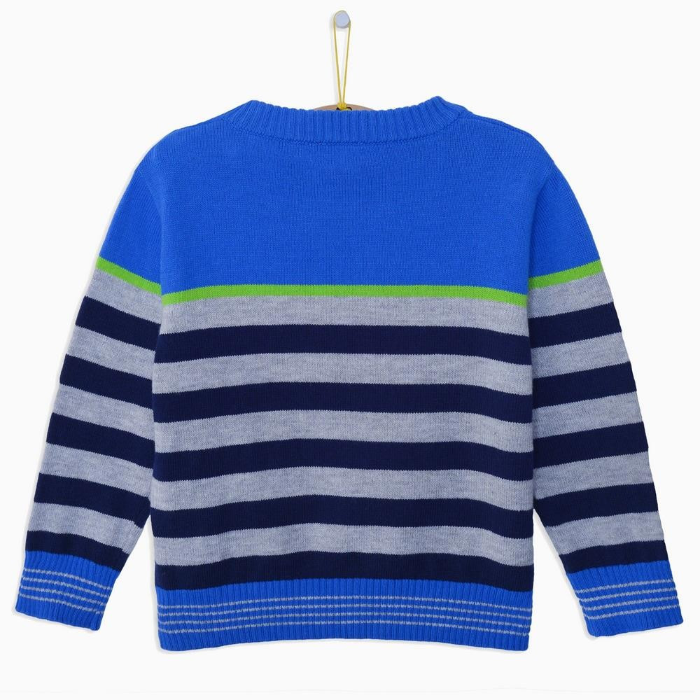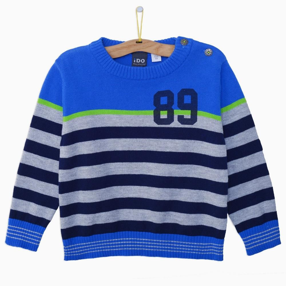 Цей трикотажний смугастий в'язаний светр iDO виконаний зі 100% бавовни. Спереду светр прикрашений аплікацією. На горловині, манжетах рукавів, поясі на талії, подвійна трикотажна гумка. На плечі є кнопки, для суттєво полегшить процес одягання Вашої дитини.