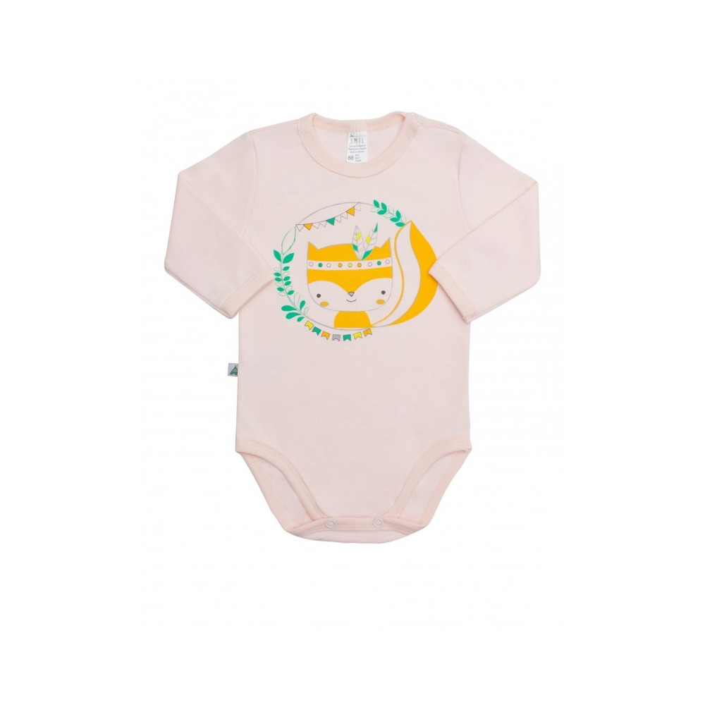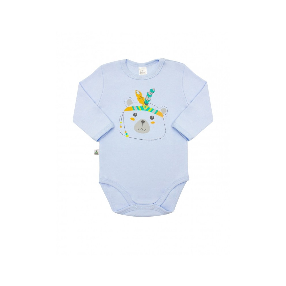 Боді з довгим рукавом виготовлено з еластичного виду бавовняного трикотажного утепленого полотна. Для зручності перевдягання застібка - кнопки, виконана на плечі і між ніжками. Еластичний матеріал добре облягає фігуру малюка і не обмежує його рухів. Модель декорована друкованим принтом.