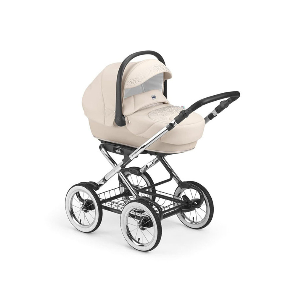Елегантна люлька, оброблена вставками з еко шкіри і прикрашена кристалами, в поєднанні з хромованими шасі з великими надувними колесами, декорованими білими обводами.