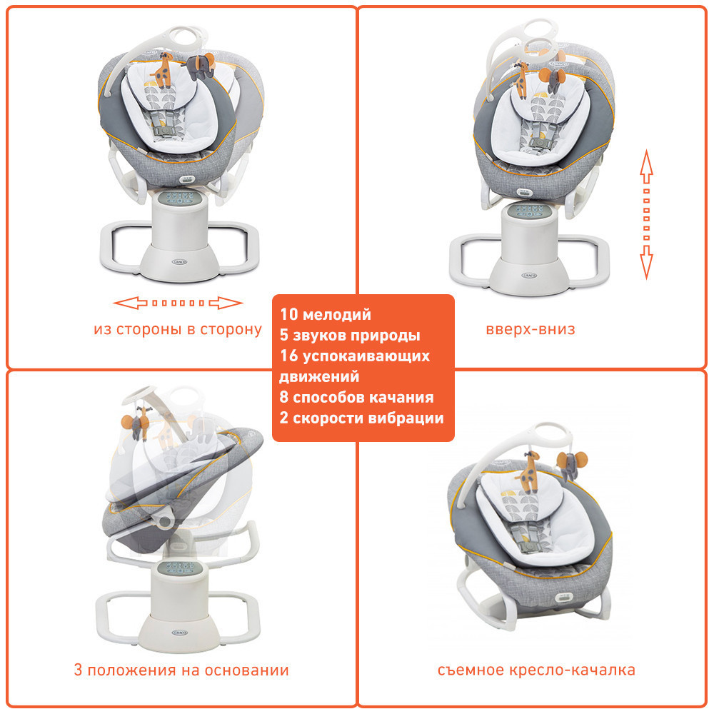 На допомогу вам прийде інноваційний заколисуючий центр Graco ALL WAYS ™ SOOTHER зі знімною люлькою - це універсальна дитяча гойдалка, що пропонує 16 видів заспокійливих рухів та обов'язково припаде до душі вашому малюкові й викличе його щиру посмішку. З 8 наявних у Graco ALL WAYS ™ SOOTHER способів гойдання ви обов'язково знайдете той, який напевно заспокоїть і розважить маленького капризулю. Graco ALL WAYS ™ SOOTHER може гойдати вашого крихітку з боку в бік або вперед назад, як йому більше сподобається. Ви зможете довірити ALL WAYS™ SOOTHER свій "скарб" і не хвилюватися про його безпеку. Звичайно він не замінить малюкові ніжні ручки батьків, але заспокоїти, розважити і навіть заспівати колискову зможе