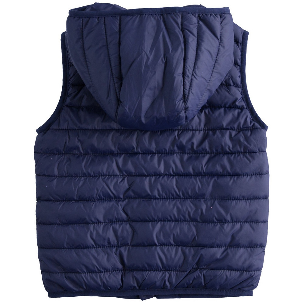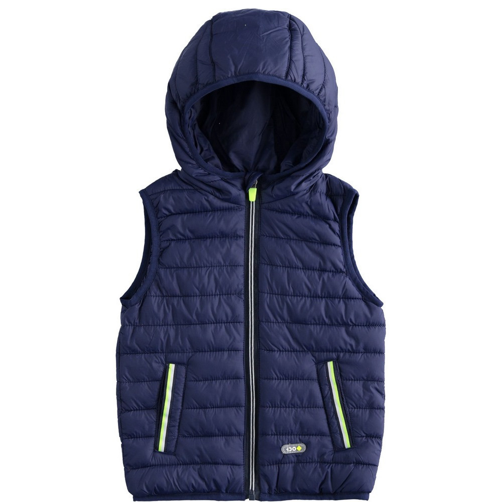 Нейлоновий жилет з каптуром iDO пропонує з хлопчакам для майбутнього сезону. Модель з стьобаними горизонтальними смугами, з боковими кишенями, застібається на блискавку. Дуже хороший, практичний предмет одягу, який можна носити один, або з джинсової курткою.